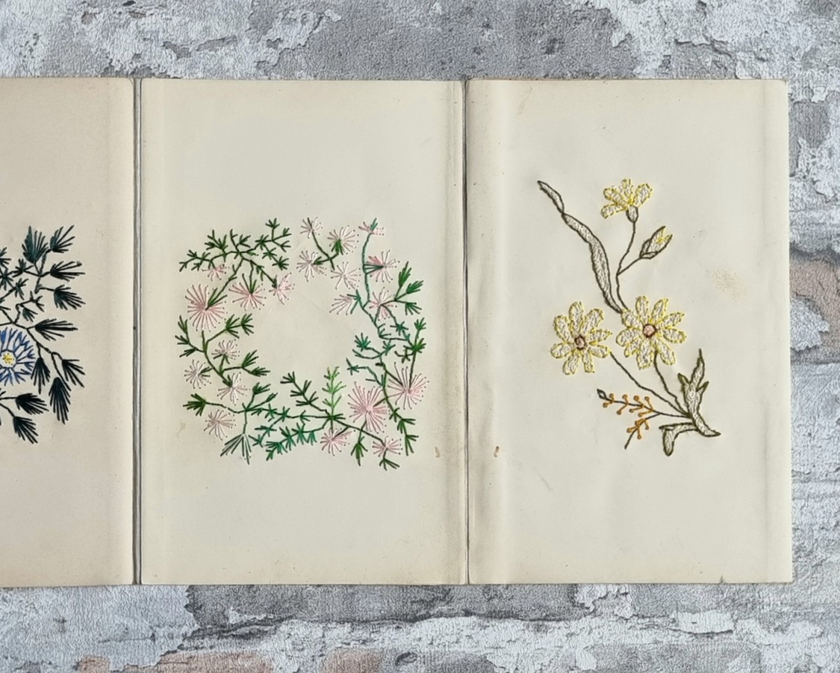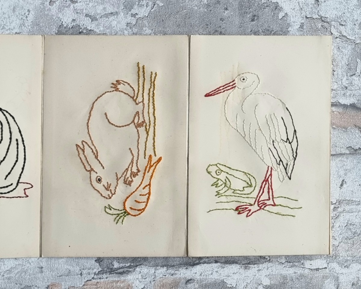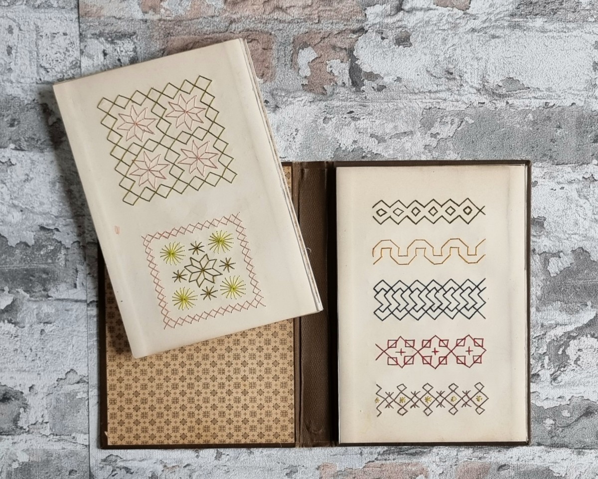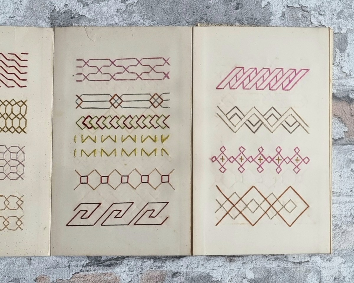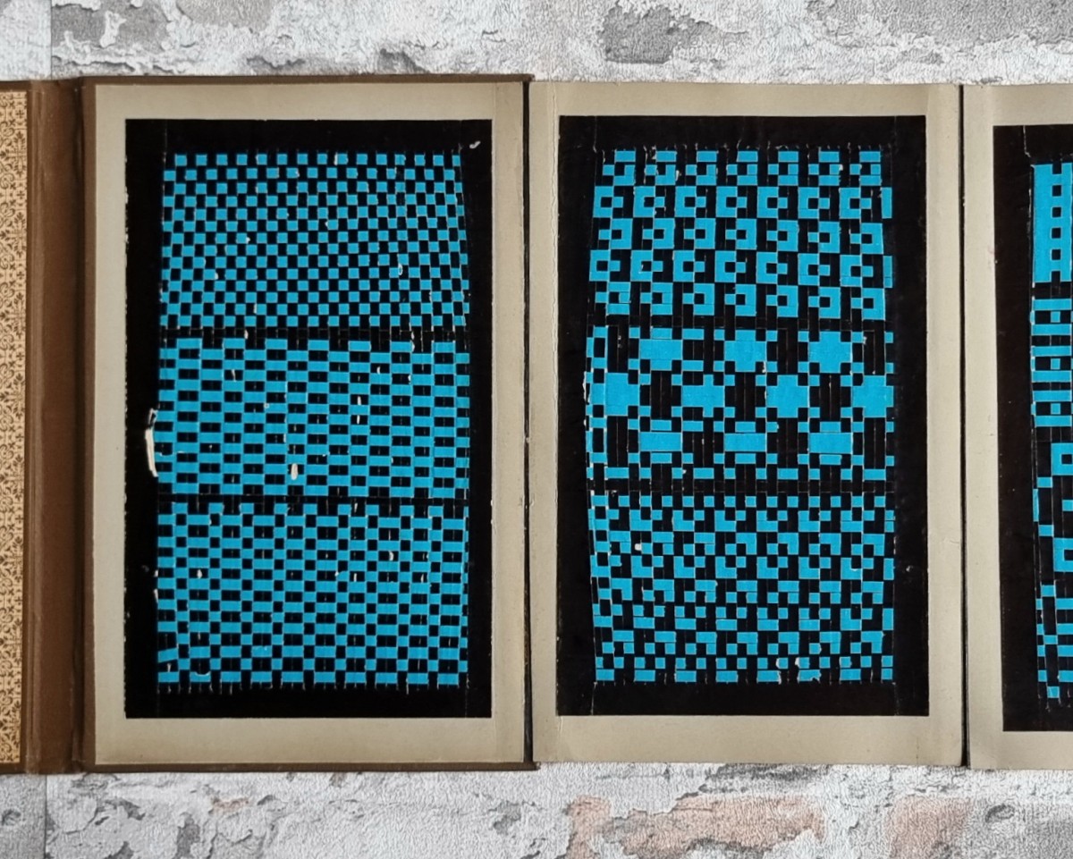 - Nähschule (schwarz): Leporello mit 32 Stickmustern in verschiedenfarbigem Stickgarn. Motive: Ornamente, Blumen und Tiere. Rückseiten der Kartons mit ornamentbedrucktem Papier bezogen.