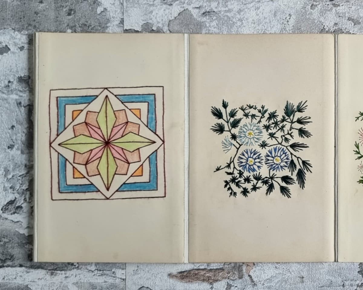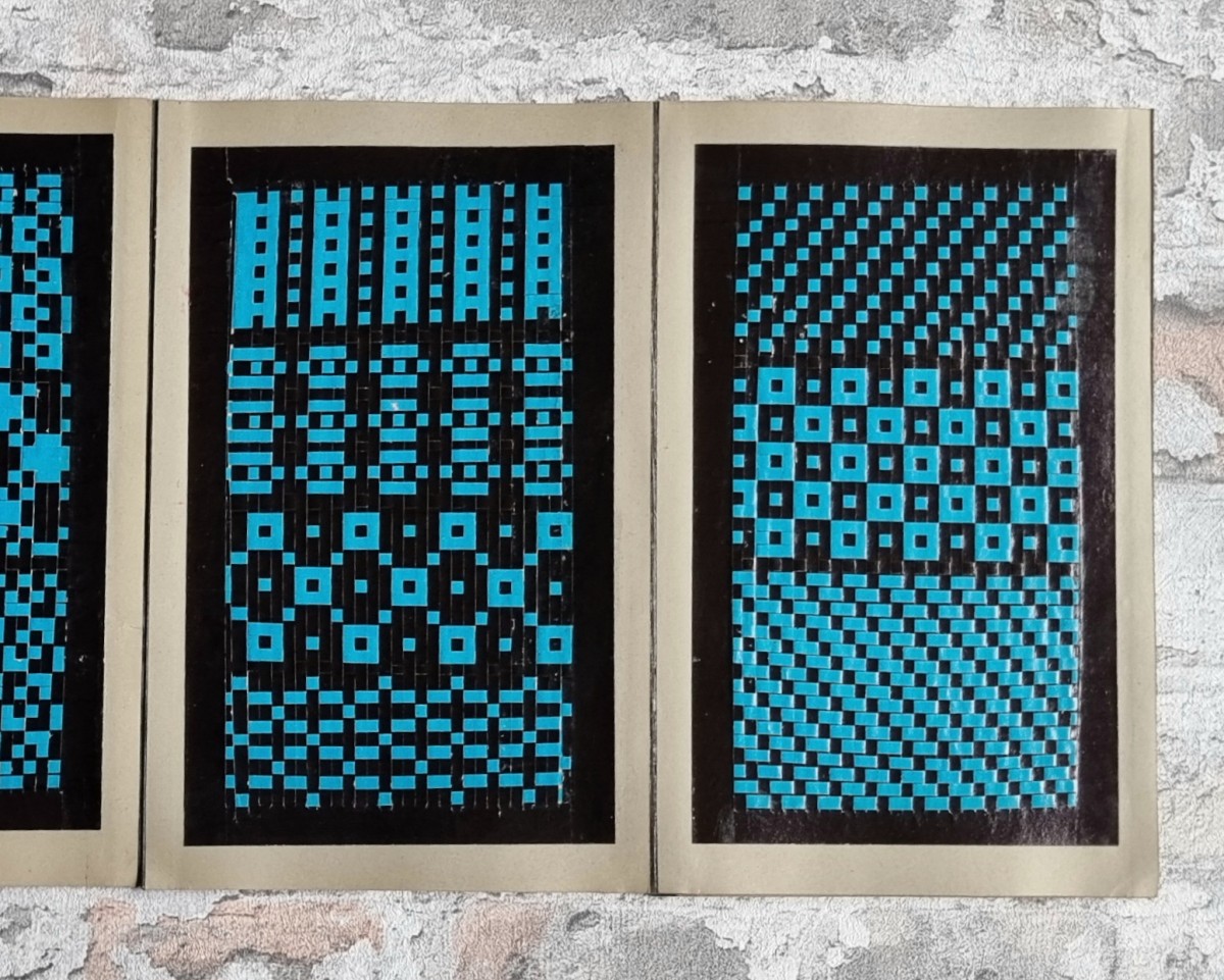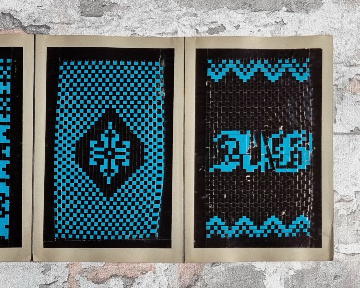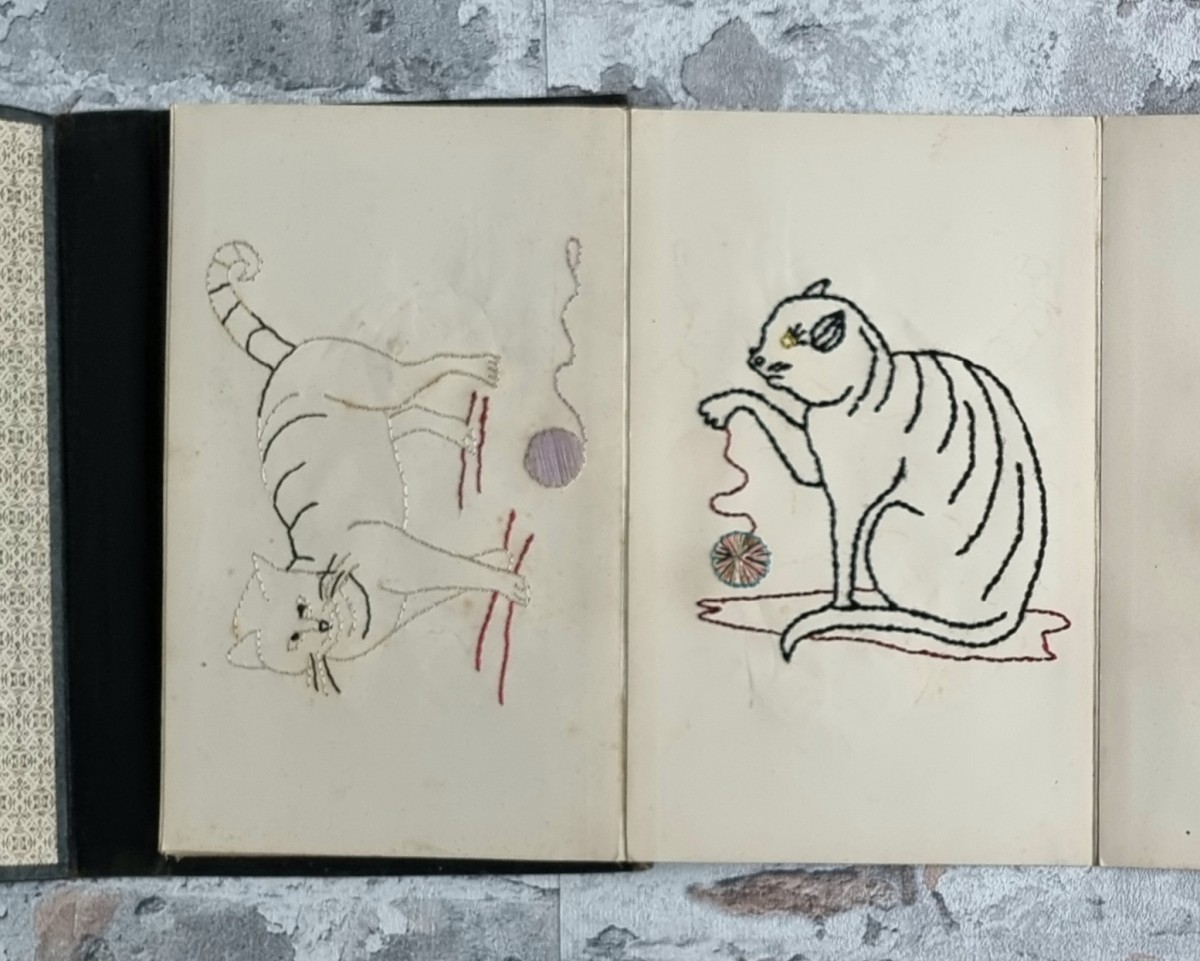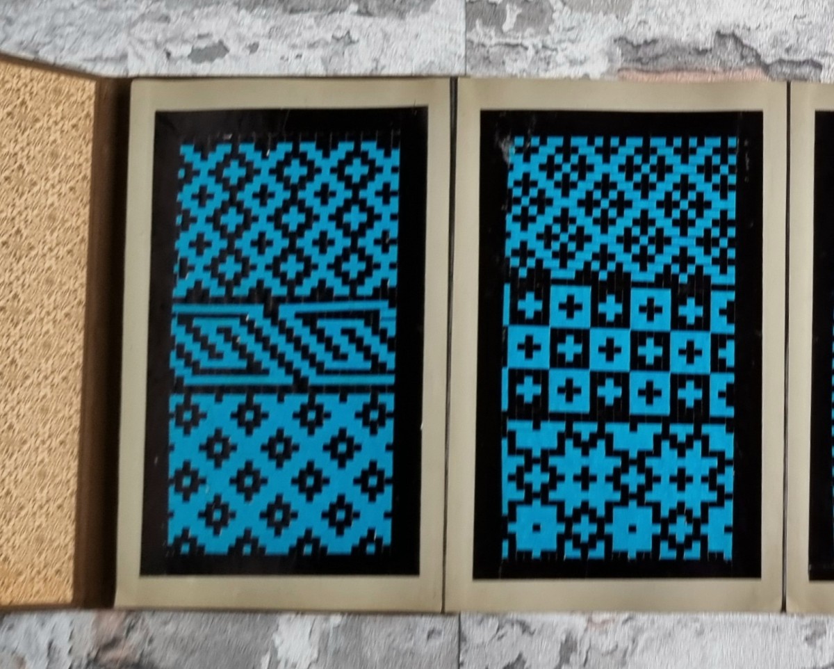 - Nähschule (schwarz): Leporello mit 32 Stickmustern in verschiedenfarbigem Stickgarn. Motive: Ornamente, Blumen und Tiere. Rückseiten der Kartons mit ornamentbedrucktem Papier bezogen.