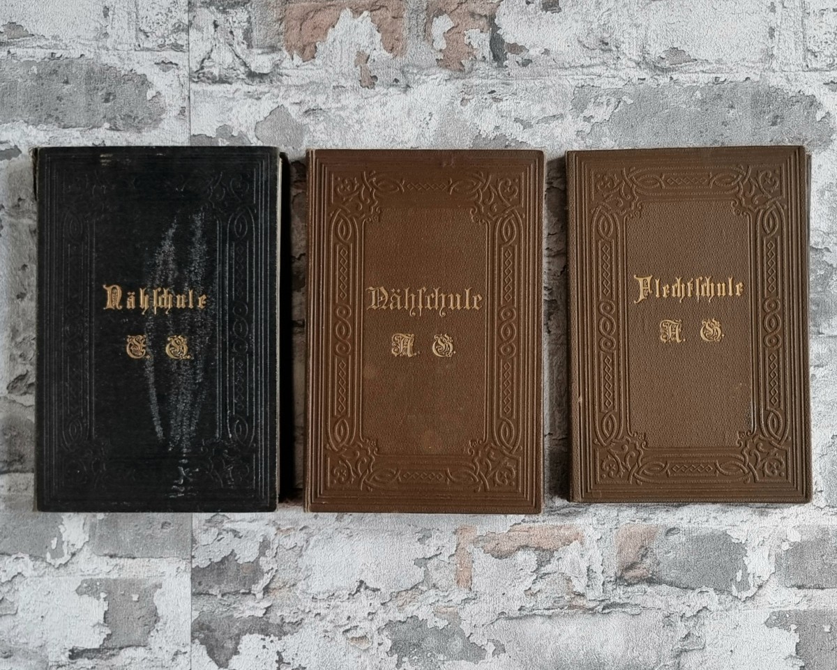 Drei Leporellos mit handgearbeiteten Schulübungen. 21,5 × 14,3 cm. Erhaben geprägte Einbände mit goldgeprägten Titeln und Initialen (A. S. bzw. E. S.)