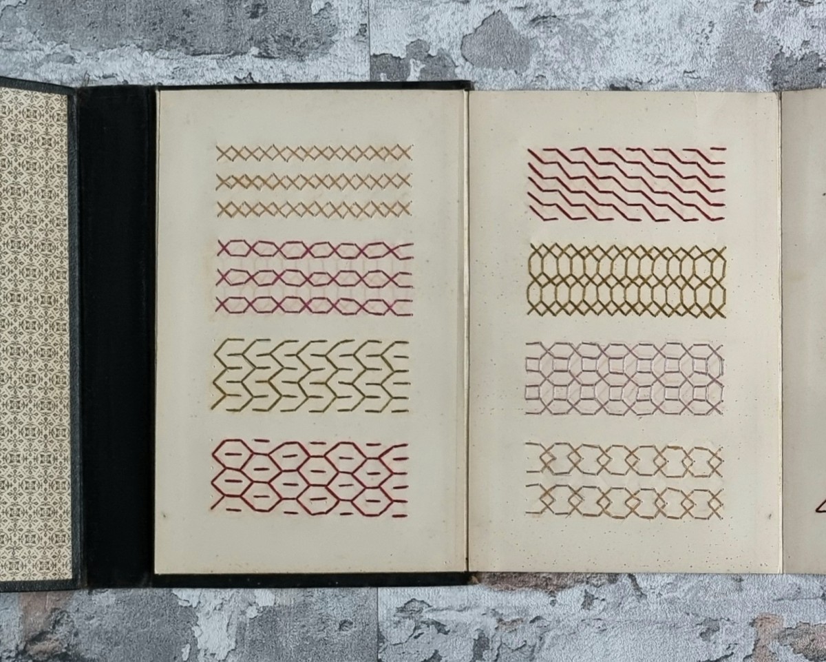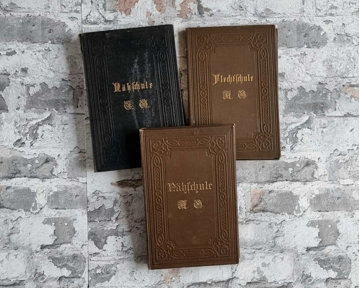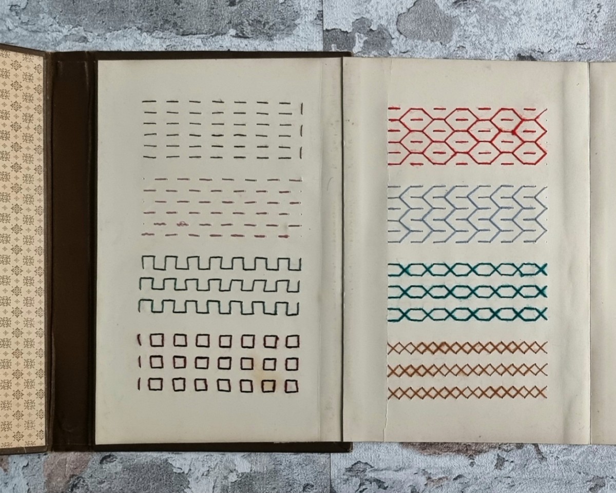 - Nähschule (braun): Leporello mit 19 Stickmustern. Ein Leporello mit 12 Kartons, lose im Einband liegend, sowie ein weiteres Leporello mit 7 Kartons, fest in den Einband eingebunden. Stickproben in verschiedenfarbigem Stickgarn mit Ornament- und Blumenmotiven. Rückseiten der Kartons mit ornamentbedrucktem Papier bezogen.