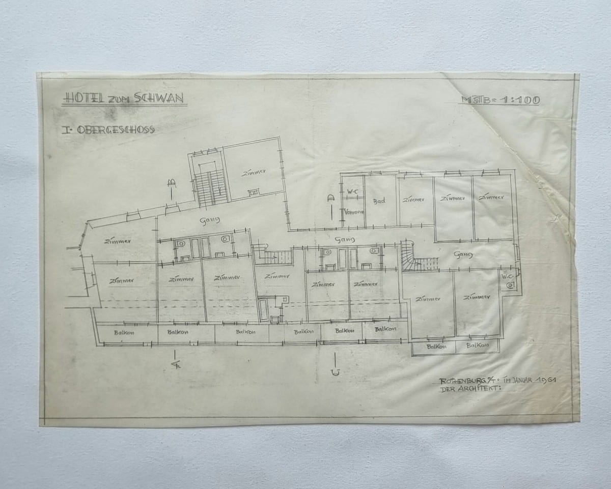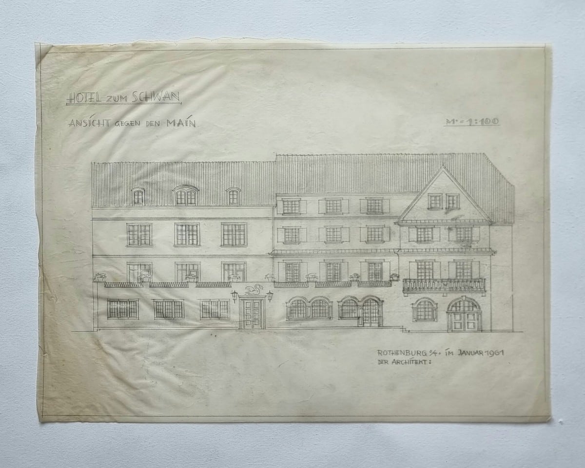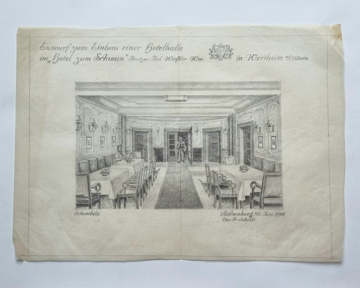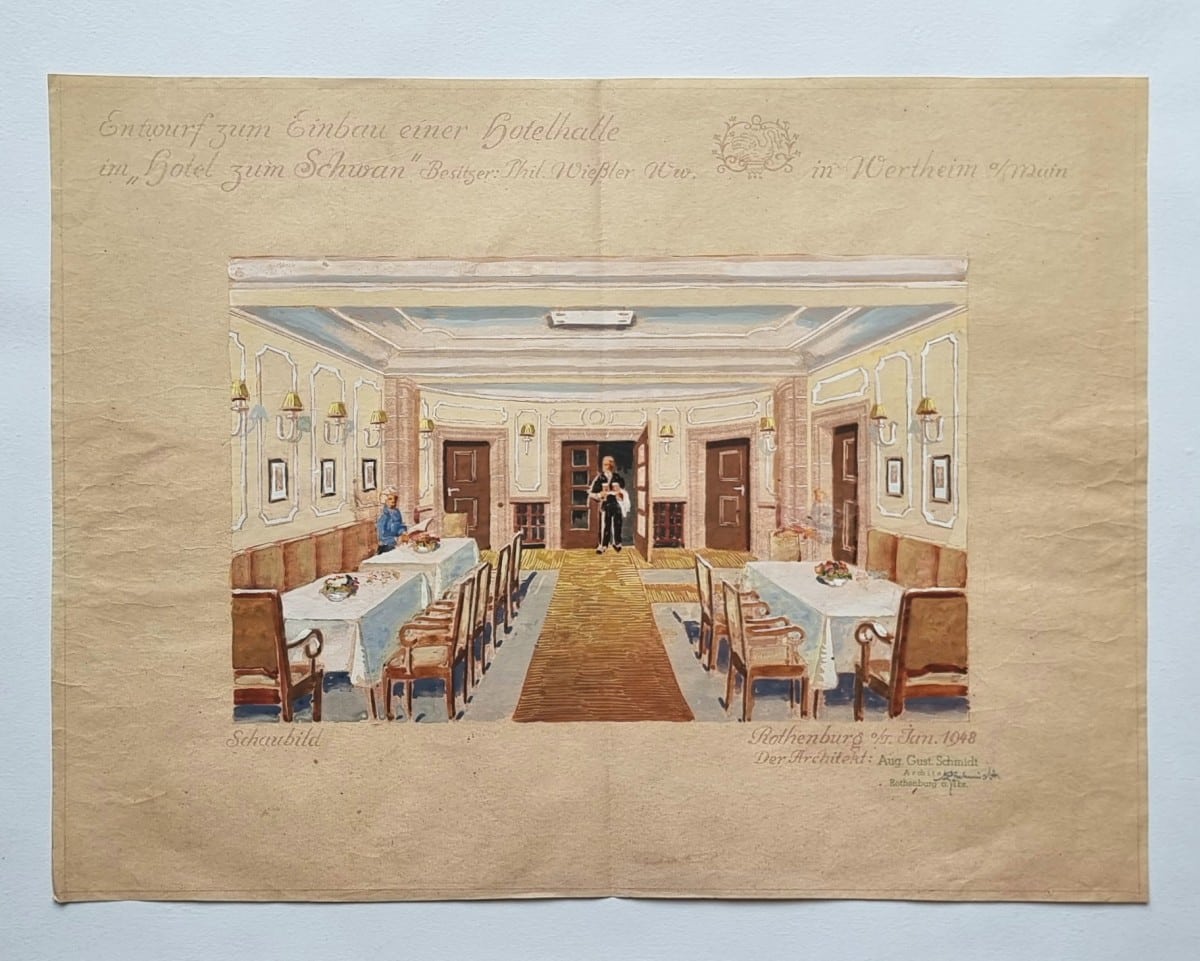 Konvolut zur Umgestaltung des Hotels zum Schwan in Wertheim am Main. Entwurfs- und Ausführungsphase 1948–1961. Enthalten: Grundrisse, Auf- und Ansichten sowie Detailzeichnungen (u. a. Entwurf des Buffets in der Hotelhalle; 2 farbige Präsentationsentwürfe); begleitend 20 Blatt Korrespondenz 1947–1963 zur Abwicklung der Bau- und Umbauarbeiten. Pläne mit Architektenvermerk Aug. Gust. Schmidt (BDA), Rothenburg o. T.