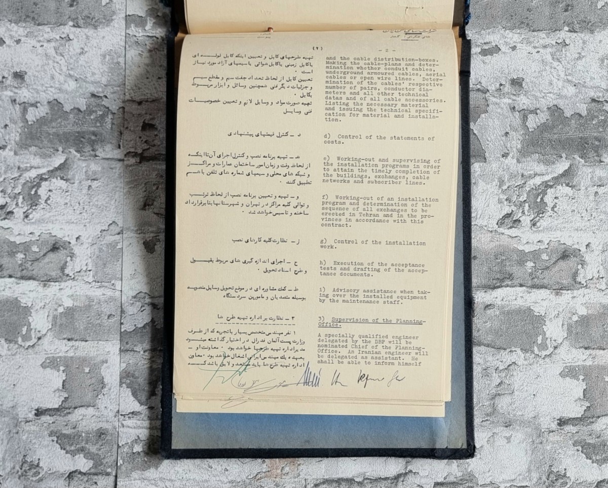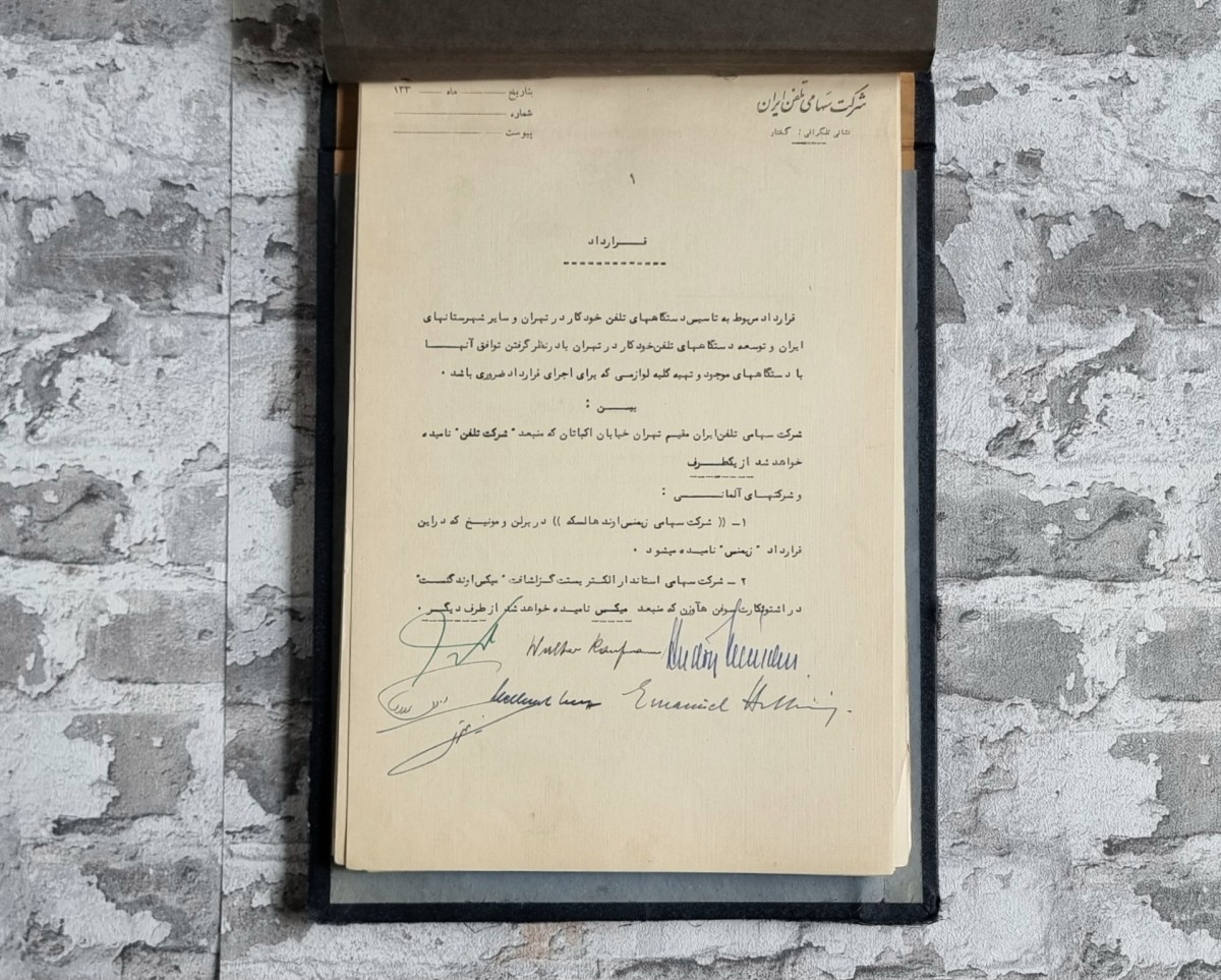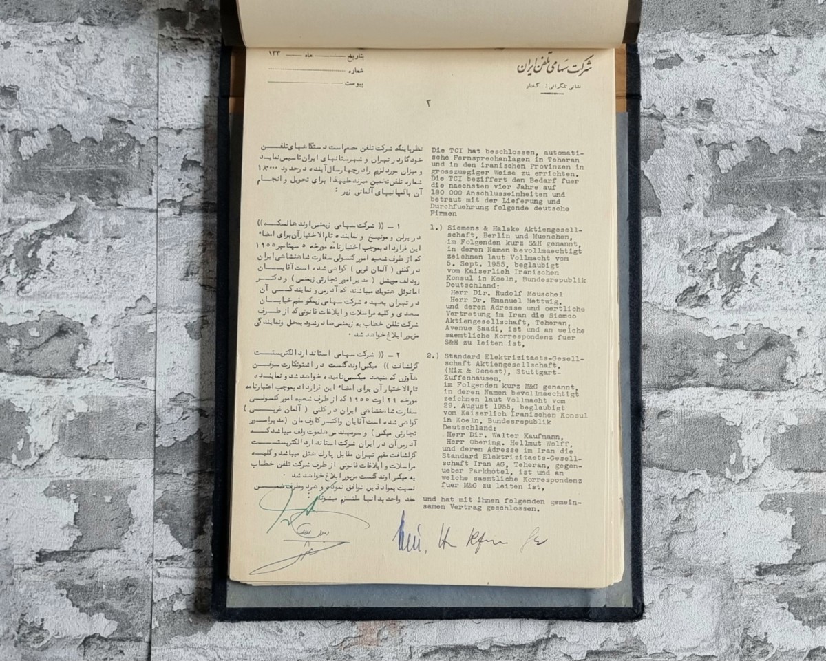 Vertrag zwischen der Telephone Company of Iran (TCI, Teheran, Khiabane Ekbatan) und den deutschen Firmen Siemens & Halske AG, Berlin/München sowie der Standard Elektrizitäts-Gesellschaft AG (Mix & Genest), Stuttgart-Zuffenhausen. Gegenstand ist die Errichtung automatischer Fernsprechanlagen in Teheran und weiteren iranischen Städten sowie die Erweiterung und Anpassung bestehender Anlagen. Bedeutendes Dokument zur deutsch-iranischen Wirtschaftsgeschichte der 1950er Jahre.