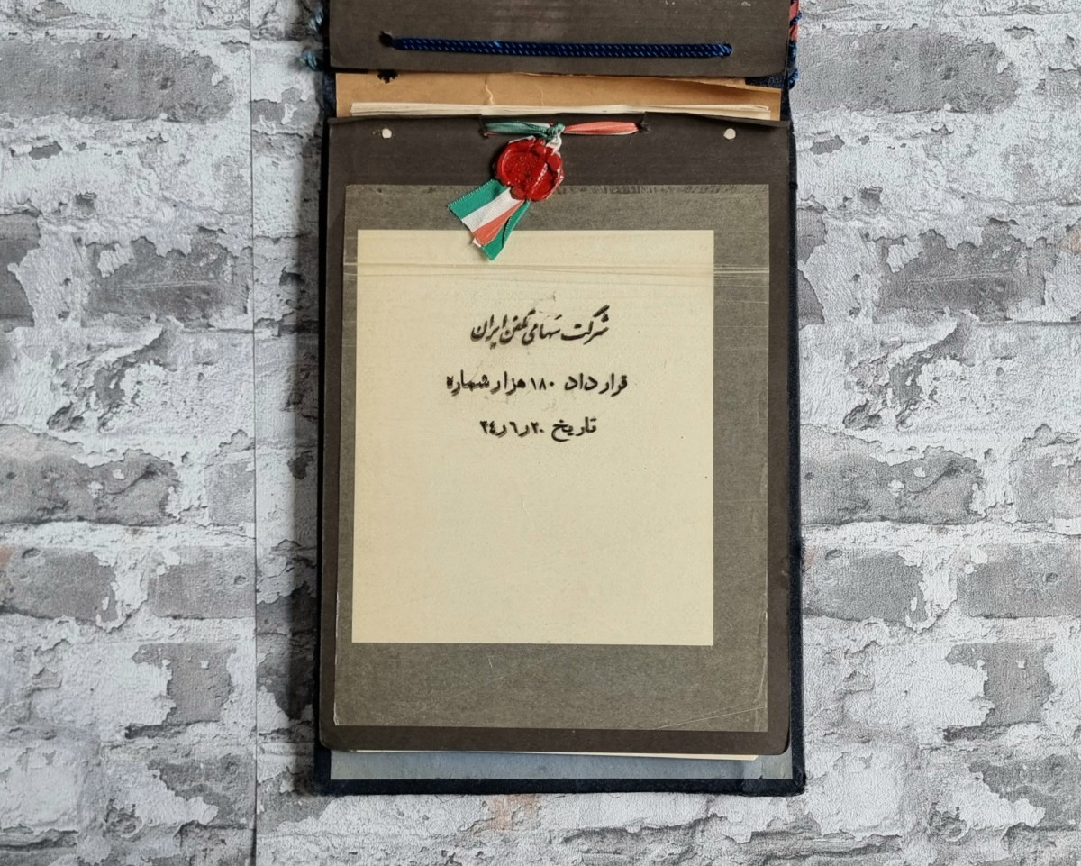 Teheran, 12. September 1955 (20.6.1934 pers. Kalender). Großformatiger Vertragsband (35,3 × 25 cm) mit blauem Einband, oben zweifach gelocht und mit blauer Kordel gebunden. Eingangsblatt mit rotem Lacksiegel und Stoffband in den Farben der iranischen Flagge, gefolgt von einer handschriftlichen persischen Seite, einer gedruckten persischen Seite mit zahlreichen Unterschriften und einer deutschen Seite mit Vertragspartnern und Unterschriften. Es folgen 29 Seiten mit ausführlichem Vertragstext in persischer und deutscher Sprache, ebenfalls vielfach unterzeichnet, sowie 10 Seiten mit persischem und englischem Text, jeweils mit Unterschriften.